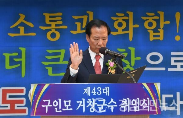 (거창/조현광 기자) = 민선7기 제43대 구인모 거창군수의 취임식이 2일 오전 10시 군청 대회의실에서 강철우, 김일수 도의원, 거창군의회 의원 등 각계각층의 인사와 군민 400여 명이 참석한 가운데 열렸다.