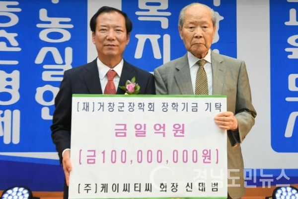 (거창/조현광 기자) = 거창군 위천면 황산마을 출신 ㈜케이씨티씨 신태범 회장이 (재)거창군장학회(이사장 구인모)에 장학금 1억 원을 기탁했다.