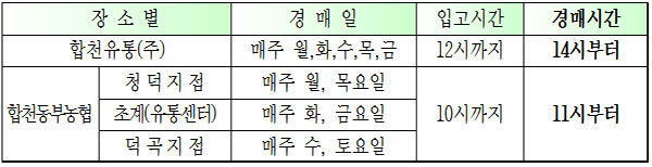 합천동부농협 공판장과 합천유통(주) 공판장은 9월 중순까지 운영할 계획이며, 취급 농산물로 마늘 경매를 우선 실시할 계획이다.
