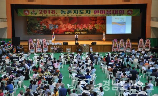 (함양/최병일) = 농촌지도자함양군연합회(회장 윤종승)가 주최한 2018 농촌지도자 한마음대회가 24일 오전 11시30분 고운체육관에서 역대회장, 각 읍·면회장, 회원 등 400여 명이 참석한 가운데 성황리에 개최됐다.