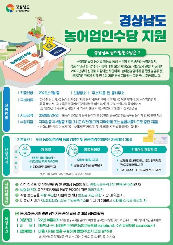 [경남도민뉴스] 경상남도는 오는 2월 한 달간 도내 18개 읍·면·동사무소에서 ‘2022년 경상남도 농어업인수당 지원사업’ 신청·접수를 일제히 실시한다고 밝혔다.