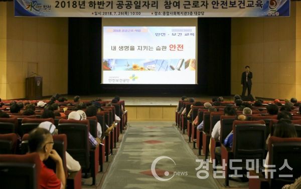 (합천/권연홍 기자) = 합천군(군수 문준희)은 26일 종합사회복지관에서 2018년 하반기 공공일자리사업 참여자 250여 명을 대상으로 공공사업장의 안전사고와 재해예방을 위한 안전보건교육을 실시했다.