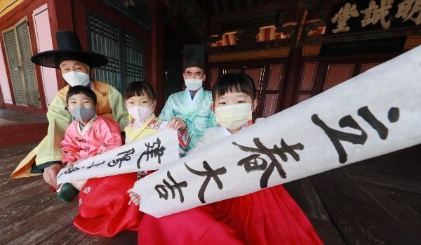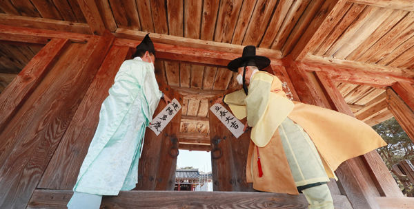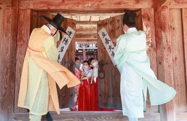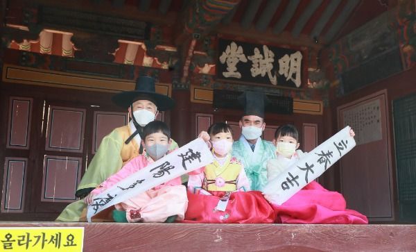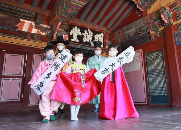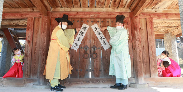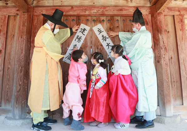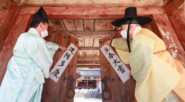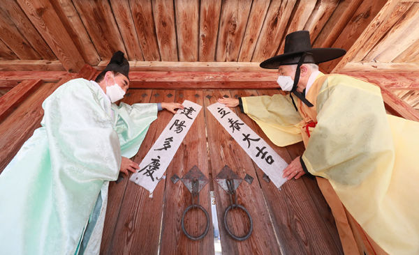 [경남도민뉴스] 절기상 입춘(立春)을 하루 앞둔 3일 유네스코 세계문화유산으로 등재된 경남 함양군 수동면 남계서원에서 이창구 남계서원 원장과 수동어린이집 아이들이 '입춘대길(立春大吉)', '건양다경(建陽多慶)' 등 입춘첩을 붙이고 있다.