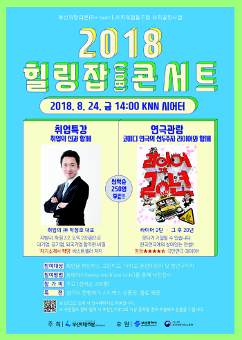 (부산/최록곤 기자) = 부산희망리본사회적협동조합(이사장 정웅현)이 오는 24일 오후 2시부터 6시까지 부산 해운대구 KNN 시어터에서 2018 힐링 잡(JOB) 콘서트를 연다.