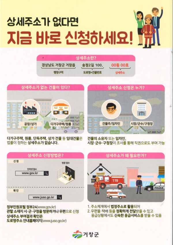 거창군 관계자는 “주민들이 상세주소 사용으로 각종 우편물과 공과금 고지서 등을 정확히 수령하고 긴급 재난상황에도 빠르게 대처할 수 있다. 아직 상세주소 신청을 하지 않은 건물주나 임차인은 적극적으로 신청하기 바란다”고 말했다.