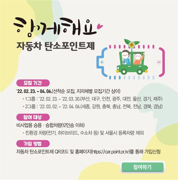 참여를 희망하는 경우 자동차 탄소포인트제 누리집(https://car.cpoint.or.kr)에서 회원 가입 후 자동차 번호판 사진, 누적 주행거리 계기판 사진, 자동차등록증 사본을 제출하면 된다.