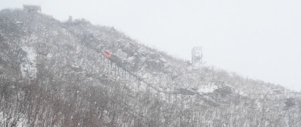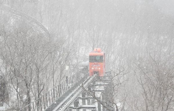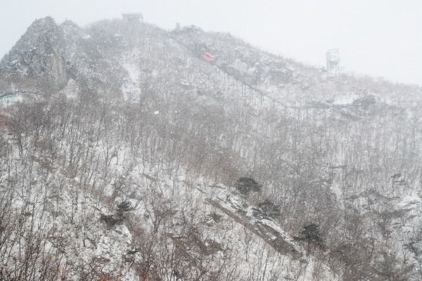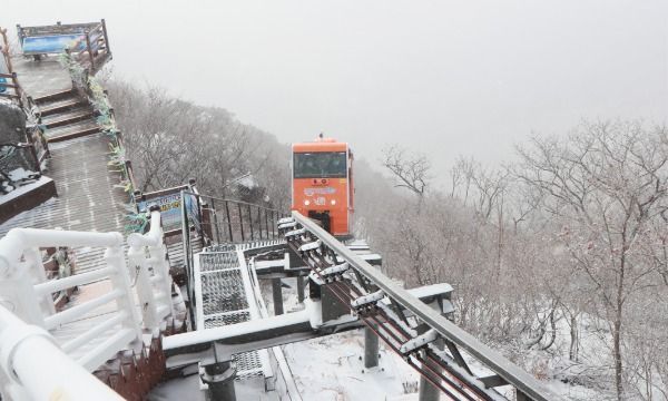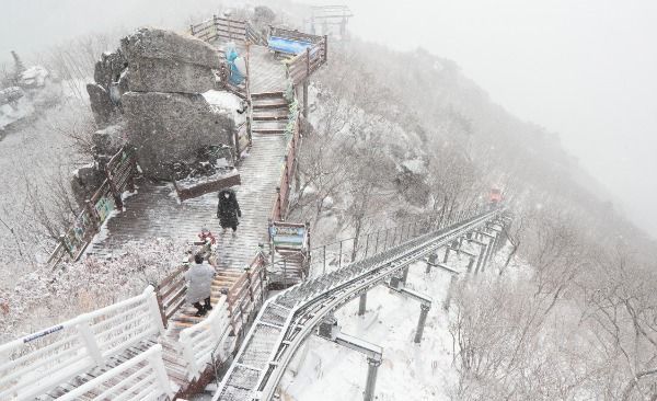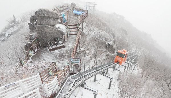 [경남도민뉴스] 절기상 우수를 사흘 앞둔 16일 경남 함양군 병곡면 대봉산휴양밸리를 찾은 관광객이 모노레일을 타며 설산을 구경하고 있다.
