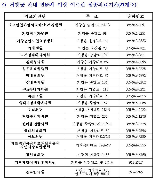 (거창/김은경) = 거창군은 2018년 내달 2일부터 만65세 이상(1953.12.31이전 출생자) 어르신을 대상으로 인플루엔자 무료 예방접종을 실시할 계획이다. (단, 주소지가 타지역인 만65세 ∼ 74세 주민은 내달 11일부터 접종 가능)