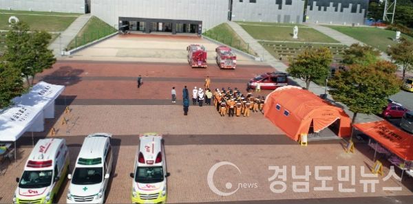 (거창/김은경) = 거창소방서(서장 조길영)는 지난 18일 거창읍 거창스포츠파크에서 거창군청, 경찰서, 보건소 등 유관기관 참석한 가운데 거창공장 동양메닉스 화재 발생을 가정하여 긴급구조통제단 가동훈련을 실시했다.