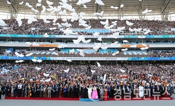 이 날 행사는 110개국 지도자가 지구촌·한반도 평화 통일 방안을 모색하기 위해 한반도에 모인 가운데 ‘9.18 평화 만국회의 4주년 기념식’으로 인천 아시아드 주경기장에서 진행됐다.