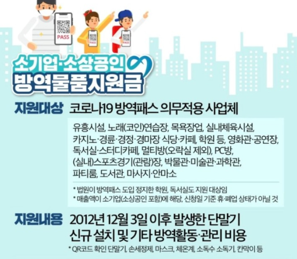 ‘소기업․소상공인 방역물품 지원’은 방역패스 전면 실시에 따라 qr코드 확인용 단말기 등을 의무 구비해야 하는 소기업·소상공인들을 위해 정부에서 시행하는 사업이다.