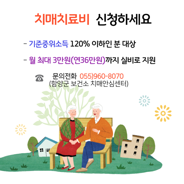 치매치료관리비 지원에 관한 자세한 사항은 함양군 치매안심센터(☎960-8070) 또는 24시간 치매상담콜센터(☎1899-9988)로 전화하면 된다.
