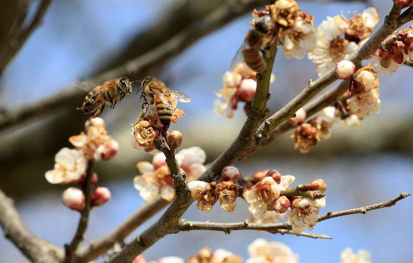 5일 산청군 단성면 남명 조식 유적지 산천재의 매화나무 ‘남명매’가 꽃망울을 터트렸다. 매화향에 이끌린 꿀벌들이 바삐 움직이고 있다.