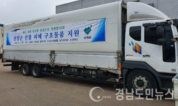 (산청/최광용 기자) = 경남 산청군의 지역 기업들이 대규모 산불로 어려움을 겪고 있는 강원도 고성 지역 이재민들에게 구호물품을 전달했다.