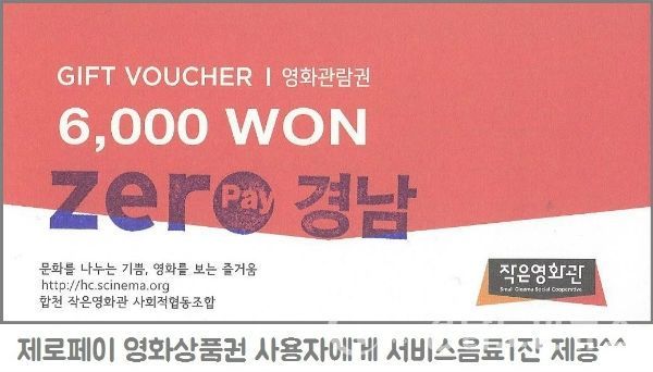(합천/권연홍 기자) = 합천군(군수 문준희)에서는 경상남도와 함께 제로페이 합천 가맹점에서 1만 원 이상 결제하는 소비자를 대상으로 합천시네마 영화 관람권(6천원 상당)을 지급해주는 “제로 페이 경남 활성화 이벤트”를 16일 부터 실시한다고 밝혔다.
