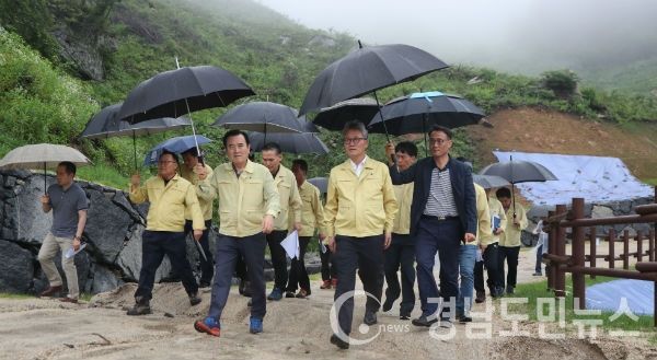 (경남도민뉴스) = 지난 20일 제5호 태풍 ‘다나스’로 함양군 최고 155mm의 강우가 발생하여 호우 및 산사태 주의보가 발령된 가운데 김재현 산림청장이 함양군 산림재해 복구사업장을 점검했다고 22일 밝혔다.