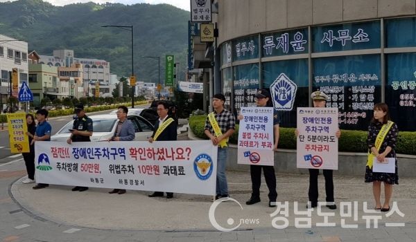 (하동/정범식 기자) = 하동군은 30일 아침 경찰서 앞 회전교차로 일원에서 하동경찰서와 함께 장애인전용주차구역 지키기 홍보캠페인을 펼쳤다.