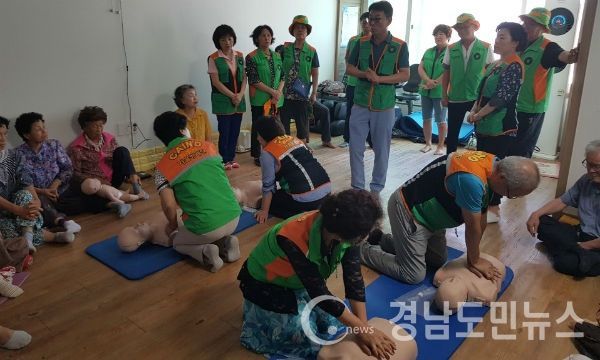 이번 교육은 20여 명의 주민들이 참석한 가운데 심폐소생술 교육지원을 나온 진주시 자율방재단(단장 이군식)이 이론과 실습을 병행한 알찬 구성으로 진행했고, 교육에 참석한 주민들도 애니를 활용한 실습에 적극 참여하는 모습을 보여줬다.
