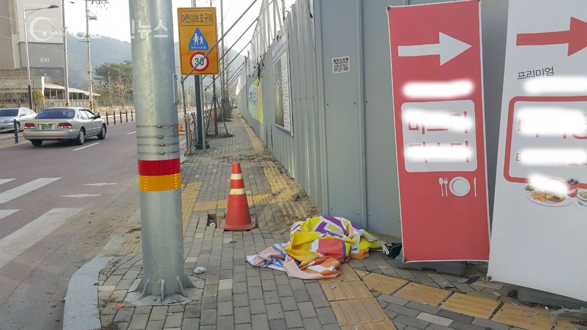 또한, 공사용 가림막의 일부는 뜯겨 나간 상태로 방치되고 있어 시민들 안전에 더더욱 위협을 가하고 있는 상태이다.
