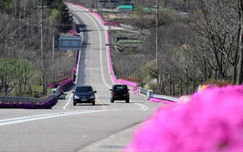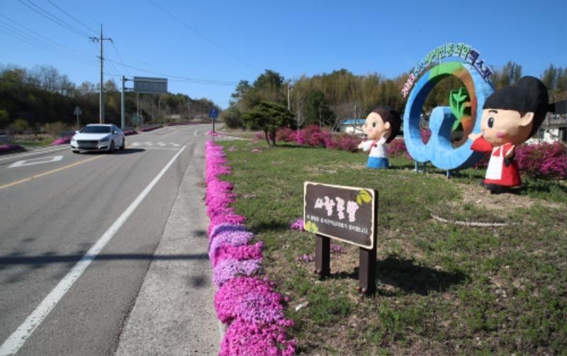 16일 산청 동의보감촌으로 향하는 도로변에 꽃잔디가 만개해 보는 이의 눈을 즐겁게 하고 있다.