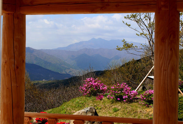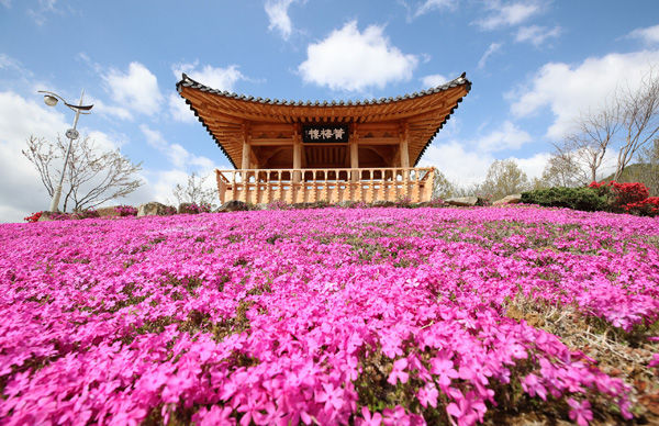 맑고 청명한 봄날씨를 보인 23일 지리산 천왕봉과 중봉을 한 눈에 볼 수 있는 산청 차황면 황매루에 분홍빛 꽃잔디가 만개해 눈길을 끈다.