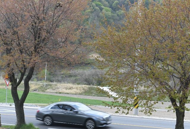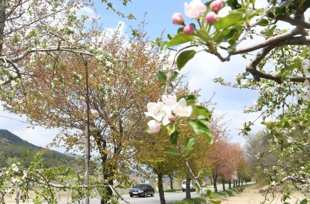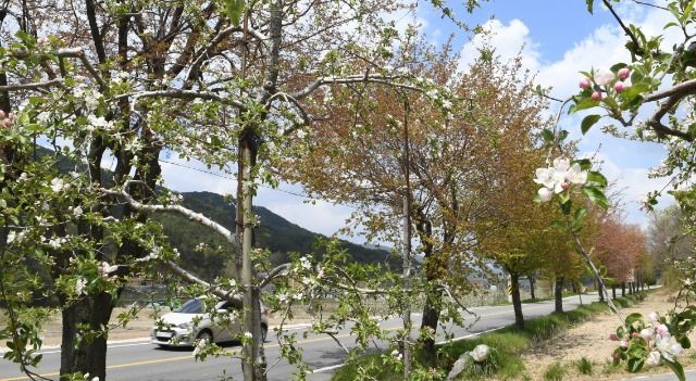 27일 경남 거창군 주상면의 한 도로변 사과밭에 냉해를 입은 사과꽃이 피어 있어 있는 가운데 길옆 가로수 잎은 이상 저온으로 파릇파릇해야 할 나뭇잎이 갈색을 띠고 있다.