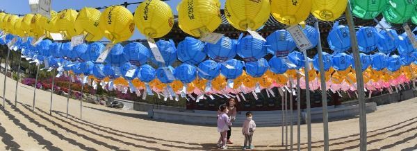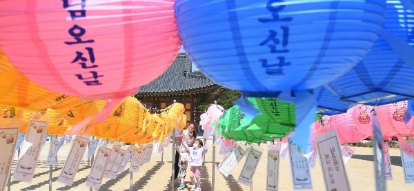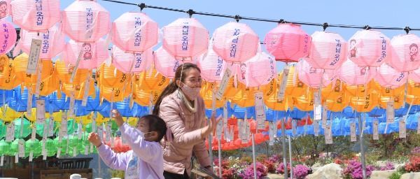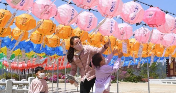 불기2564(2020)년 부처님 오신날을 이틀 앞둔 28일 경남 거창군 가조면 소림사에서 엄마와 아이가 마스크를 쓴 채 연등을 설치하고 있다.