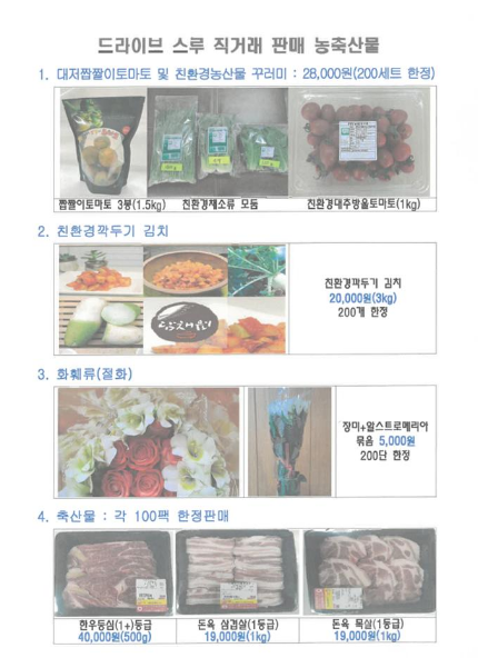 축산물은 ▲한우 등심(1+) 500g에 4만 원(100팩 한정), ▲삼겹살(1등급) 1kg에 1만9천 원(100팩 한정), ▲목살(1등급) 1kg에 1만 9천 원(100팩 한정)으로 시중 가격보다 20~30% 저렴한 가격으로 직거래한다. 단, 행사는 준비된 농축산물의 판매 완료 시까지로 준비된 수량만 한정 판매한다.