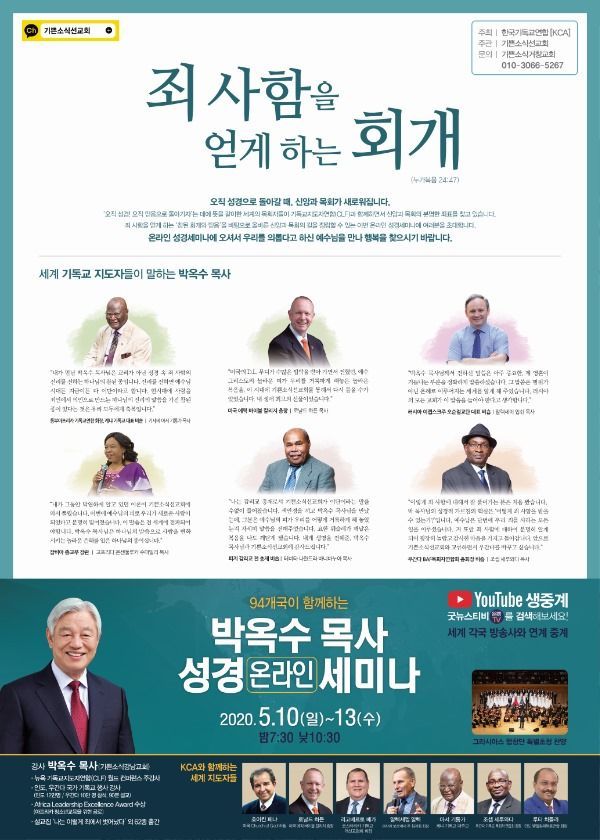 한국기독교연합(KCA; Korea Christian Association)이 주최하고 기쁜소식선교회가 주관하는 ‘박옥수 목사 온라인 성경세미나’는 5월 10일(일)부터 13일(수)까지 인터넷방송‘GOODNEWS TV’유튜브 채널과 공식 어플리케이션을 통해 전 세계에 생중계되며, 동시에 각국의 방송과도 연계해 중계된다.