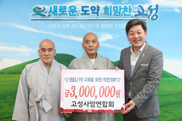 고성사암연합회(회장 약수암 수운스님)는 5월 11일 고성군청을 방문해 코로나19 극복을 위한 착한기부릴레이에 동참 의사를 밝히며 성금 300만 원을 기탁했다.