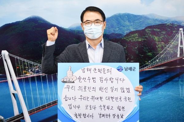 장충남 남해군수가 지난 12일 코로나19를 극복하고 의료진과 방역 관계자, 어려움을 겪는 이들에게 희망을 전하는 ‘코로나19 극복 희망 캠페인’에 동참했다.
