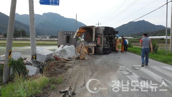 거창군 가조면 원천마을 입구 도로상에서 지난 22일 오후 5시 40분경 석재 운반을 하는 대형덤프트럭(30t) 전복사고가 발생했다.