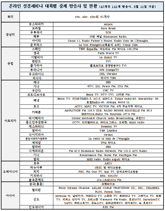 특히, 각국 방송사들은 코로나19로 인해 불안, 우울함을 느끼며 마음이 지쳐있는 사람들이 가정에서 말씀을 듣고, 함께 기도하며 소망과 위로를 받을 수 있는 온라인 성경세미나의 취지에 공감하며, 중계에 적극 나섰다.