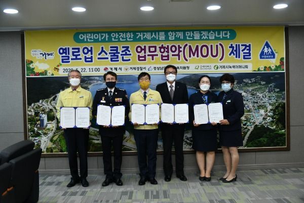 거제시는 민관 협력으로 옐로업 스쿨존 사업을 추진하기 위해 5월 22일 거제시청 시장실에서 거제경찰서, 거제교육지원청, 굿네이버스 경남서부아동권리센터, 거제시녹색어머니회와 업무협약(MOU)을 체결했다.