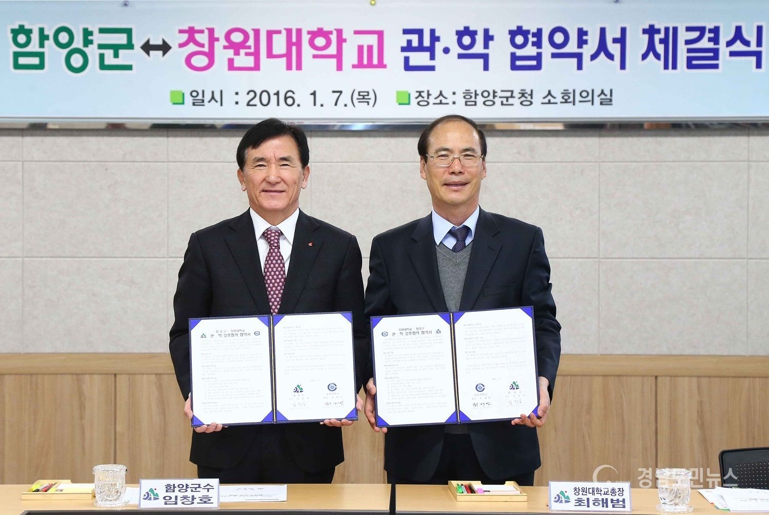 임창호 군수와 최해범 총장이 협약서에 서명하고 상호발전을 위해 노력키로 협약함에 따라 군과 창원대학은 지역사회발전을 위한 공동연구와 지역우수인재양성에 협력하며 지속적인 교류활동을 벌이게 된다.