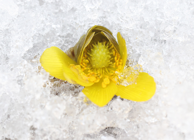 [경남도민뉴스] 포근한 날씨를 보인 11일 경남 함양군 병곡면 대봉산휴양밸리 일원에서 봄의 전령사로 불리는 복수초가 쌓인 눈을 비집고 꽃망울을 터트리고 있다.