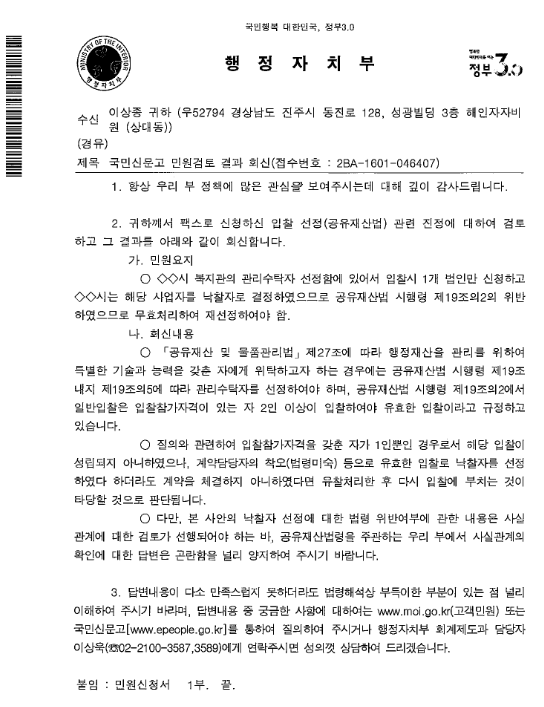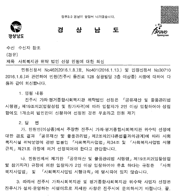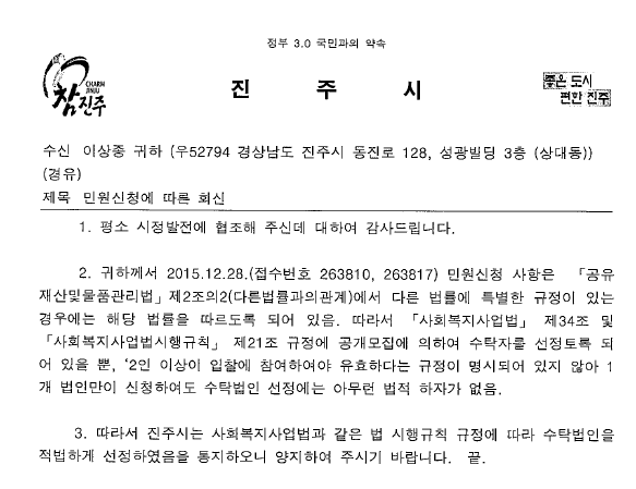스님은 진주장애인종합복지관 외에도 이번에 진주시에서 위탁한 가좌·평거사회복지관도 진주시가 위탁업무를 잘 못 처리해 민원을 제기한 결과 행정자치부에서 회신이 왔는데, 진주시와 경상남도에서 회신한 공문결과와는 달리 '계약담당자의 착오(법령미숙) 등으로 유효한 입찰이 성립되지 않았다'고 회신하였다는 것이다.