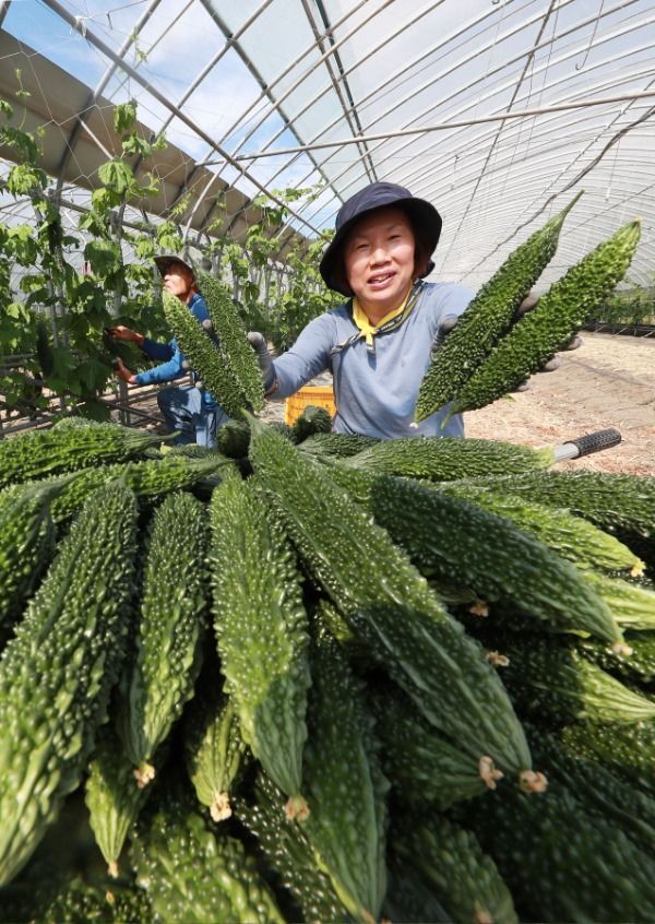 11일 경남 함양군 안의면 성북마을 우두식(63)씨 부부가 여주(쓴오이)를 첫 수확하고 있다.