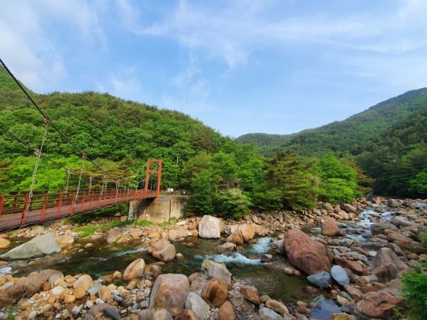 길이 끝나는 유평마을에 자리한 가랑잎 초등학교를 멀리서 구경하고 돌아 내려오는 길. 이곳의 여유로움에 매료된 사람들이 반갑게 인사를 건네 온다. 그들의 얼굴에, 햇살을 받은 계곡 물 빛처럼 찬란한 미소가 걸렸다.