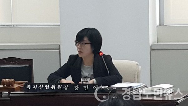 | 진주시 복지산업위원회 위원장인 강민아 의원이 조례폐지안에 대해 발언하는 같은 상임위 의원의 발언을 듣고 있다. |