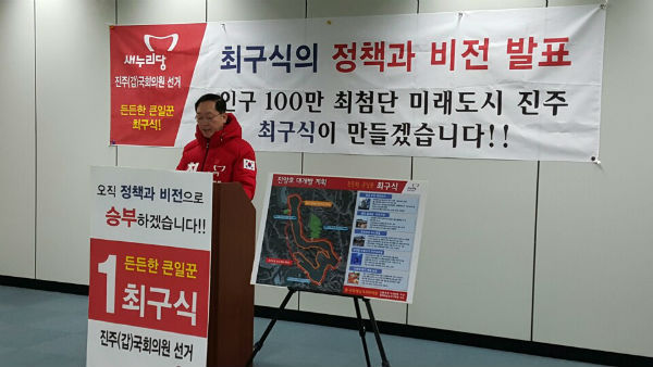 최구식 진주 ‘갑’ 국회의원 예비후보는 17일 진주시청 브리핑 룸 기자회견을 열고 ‘100만 미래도시 진주 프로젝트’비젼을 제시했다.
