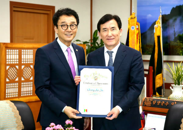 함양군은 지난 22일 오후 미국 LA한인축제재단 박윤숙 회장 등 3명이 임창호 군수를 예방해 감사장을 전달하고, 지리산청정 항노화 함양농식품 수출과 미주지역 농산물 판매·홍보 등 상호발전 방안을 논의했다.