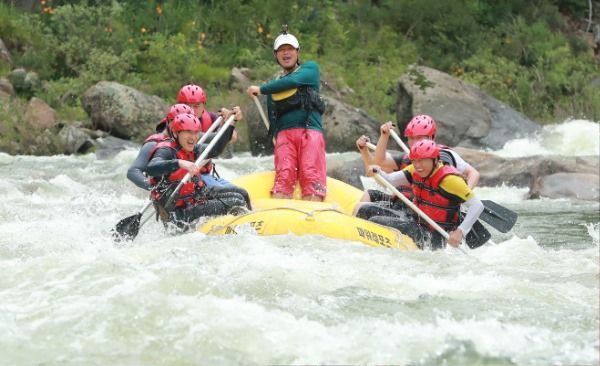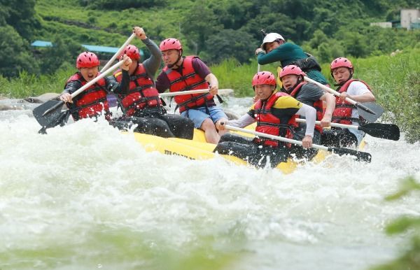 11일 경남 함양군 휴천면 엄천강에서 래프팅 동호인들이 물살을 가르며 래프팅을 즐기고 있다.