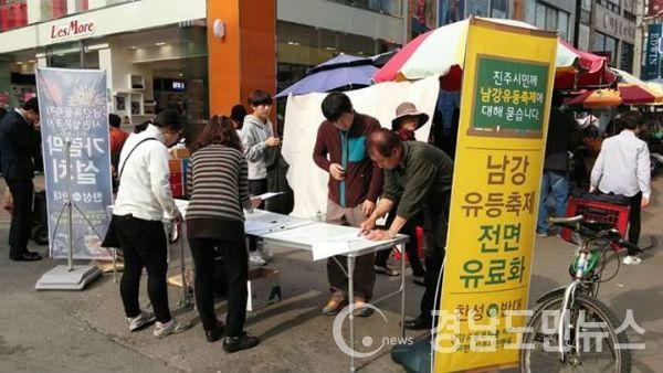 남강유등축제를 지키기 위한 진주시민행동 연대모임(시민사회단체 16개 연합, 이하 진주시민행동)은 지난 9일부터 진주시민들의 의견을 듣기 위해 매주 중앙시장 앞 거리에서 남강유등축제 유료화와 가림막설치, 2015년 축제의 평가에 대한 설문조사를 진행한다고 밝혔다.