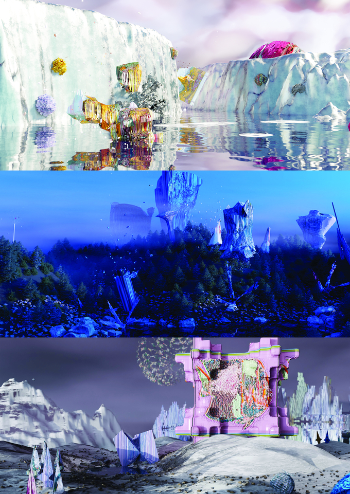 ‘플라스틱 풍경-이면의 세계’ 작품은 한윤정 작가가 조선시대 일월오봉도 병풍에 담긴 풍경에서 영감을 받아 3디(D) 플라스틱으로 뒤덮인 상상 속의 네 가지 풍경을 실감 영상으로 담아냈다.