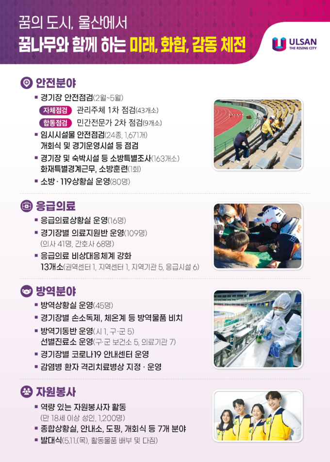 울산시는 경기장 등 체전 시설물에 대한 안전관리대책을 수립하고 전문가와 관계기관 합동점검을 완료했으며, 경기운영 요원 등의 안전교육과 안전지침서(매뉴얼) 배포 등 안전한 체전 개최를 위한 준비를 마쳤다.