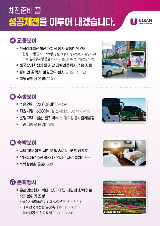 배려를 담은 따뜻한 손님맞이와 숙박질서 확립을 위해 숙박업소 행정지도도 지속 추진하고, 장애학생체전 선수단의 숙박업소 이용 편의를 위해 숙소 내 휠체어 경사로도 설치할 계획이다.