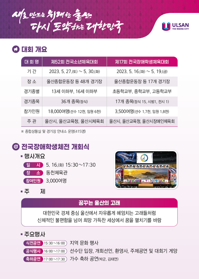 [경남도민뉴스] 울산시는 김두겸 시장이 5월 11일 오후 2시 30분 시청 프레스센터에서 ‘제52회 전국소년체육대회’와 ‘제17회 전국장애학생체육대회’의 성공 개최를 위해 체전 준비 최종 계획을 발표한다고 밝혔다.