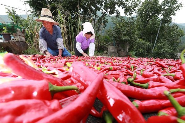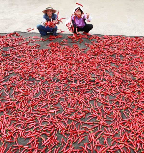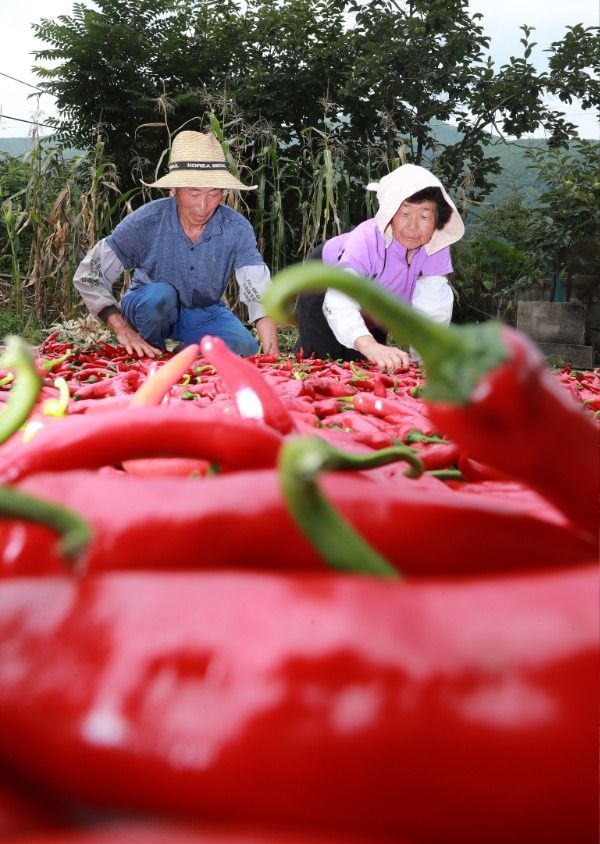 입추(立秋)를 사흘 앞둔 4일 지리산 자락인 경남 함양군 휴천면 문정리 세동마을에서 신수철씨 부부가 갓 수확한 고추를 햇볕에 말리고 있다.