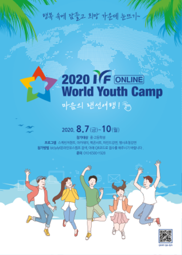 국제청소년연합(IYF)은 국내외 중ㆍ고등학생을 위해 ‘2020 IYF 온라인 월드유스캠프 (2020 IYF Online World Youth Camp, 이하 유스캠프)를 8월 7일(금)부터 10일(월)까지 나흘간 개최된다. 유스캠프는 매년 여름방학과 겨울방학 기간 동안 국내 중고등학생을 대상으로 열렸다. 하지만 올해 코로나19가 발생함에 따라, 유스캠프의 전 프로그램을 온라인으로 전환해 유튜브(YouTube)와 화상채팅플랫폼 줌(ZOOM)으로 진행한다.